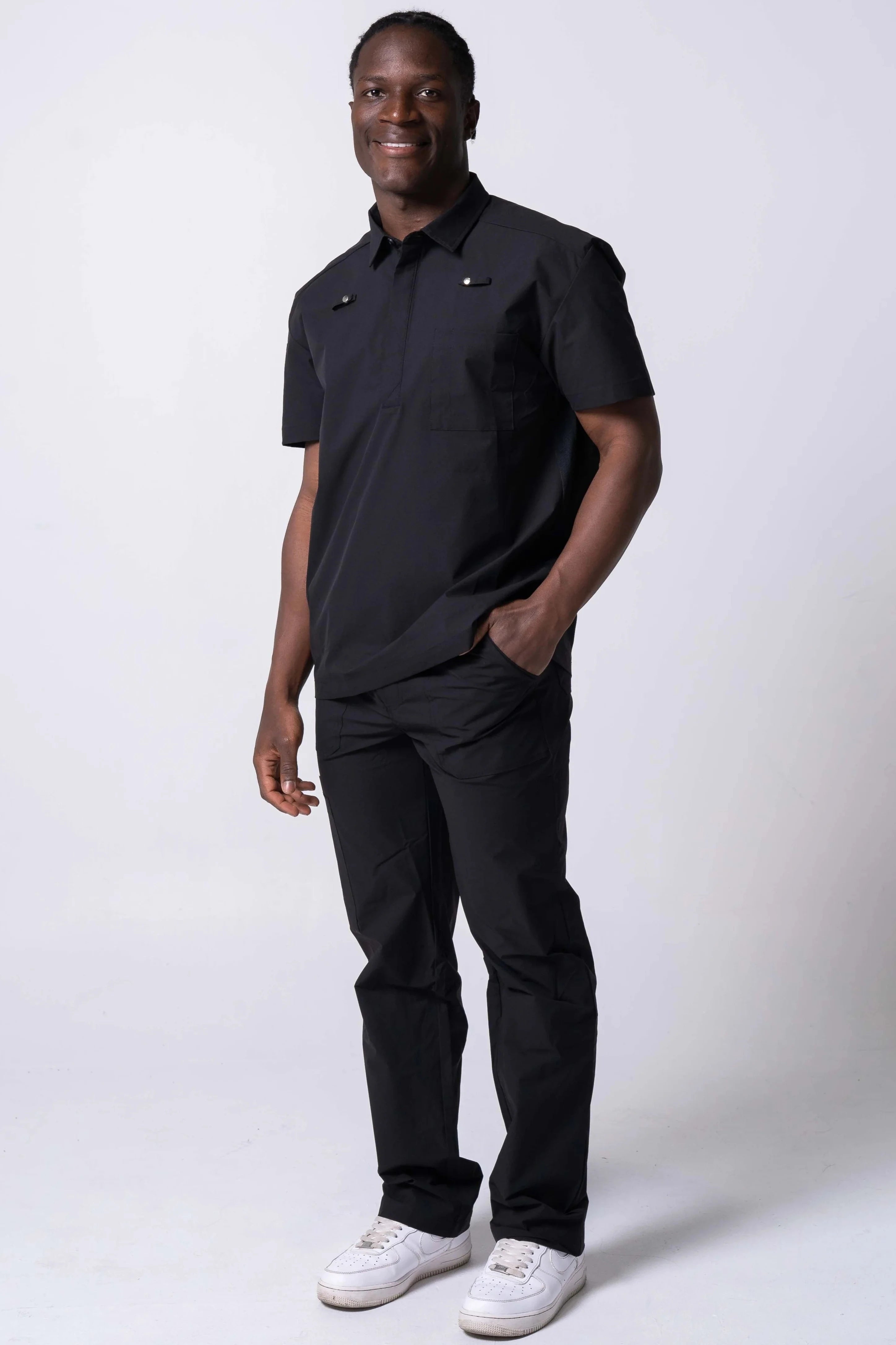 Step into comfort and durability with our Men's Deano Pant and Depolo Top in Black. This top-notch duo is tailored to keep up with the dynamic demands of healthcare professionals. The Depolo Top features a flattering fit with slightly wider shoulders and a single front pocket, complemented by side mesh panels for added breathability. Paired with the Deano Pant, which offers a straight leg cut and an elasticized waistband for ultimate comfort, this set is designed for both function and style.