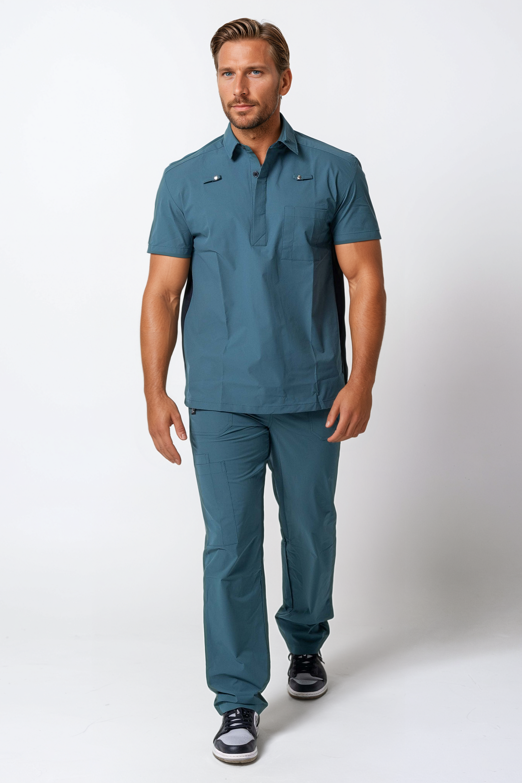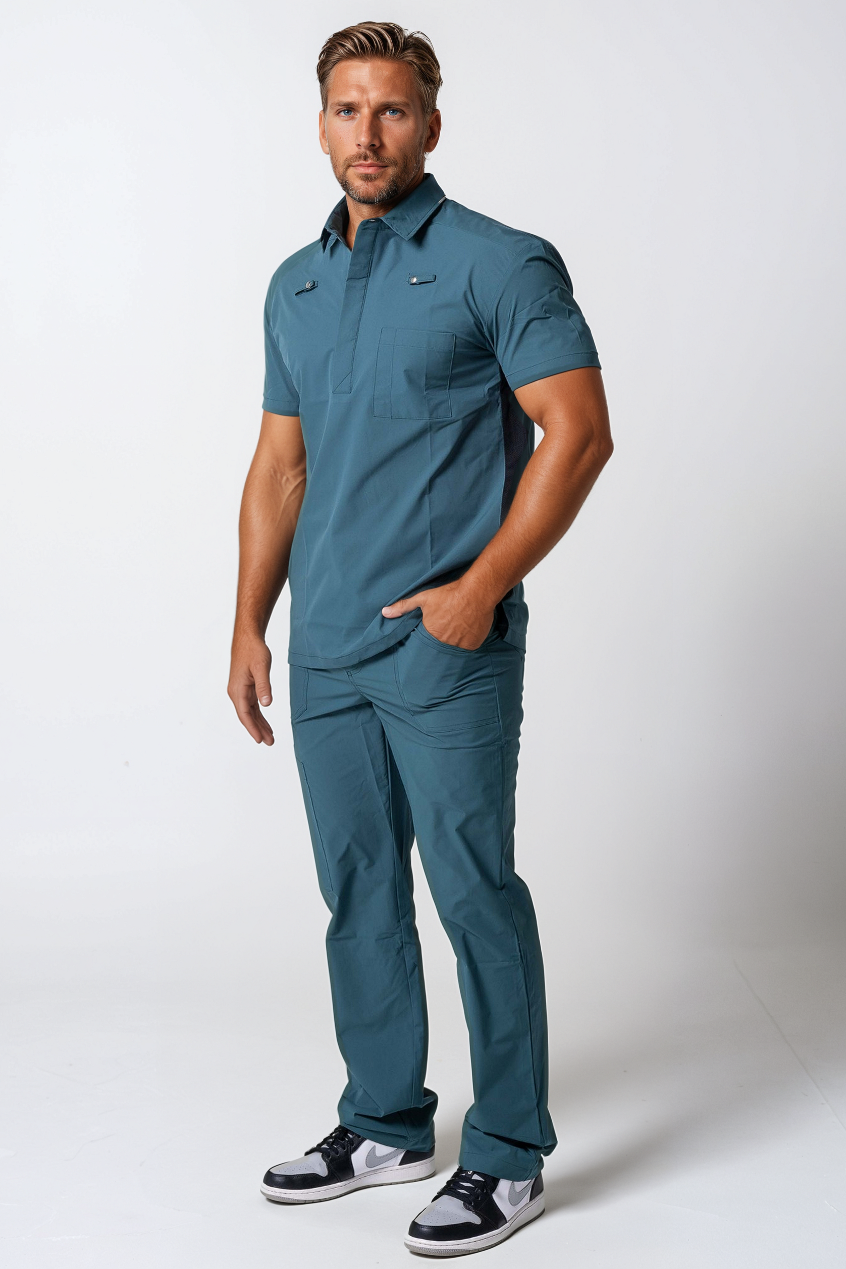 Step into comfort and durability with our Men's Deano Pant and Depolo Top in Teal. This top-notch duo is tailored to keep up with the dynamic demands of healthcare professionals. The Depolo Top features a flattering fit with slightly wider shoulders and a single front pocket, complemented by side mesh panels for added breathability. Paired with the Deano Pant, which offers a straight leg cut and an elasticized waistband for ultimate comfort, this set is designed for both function and style.