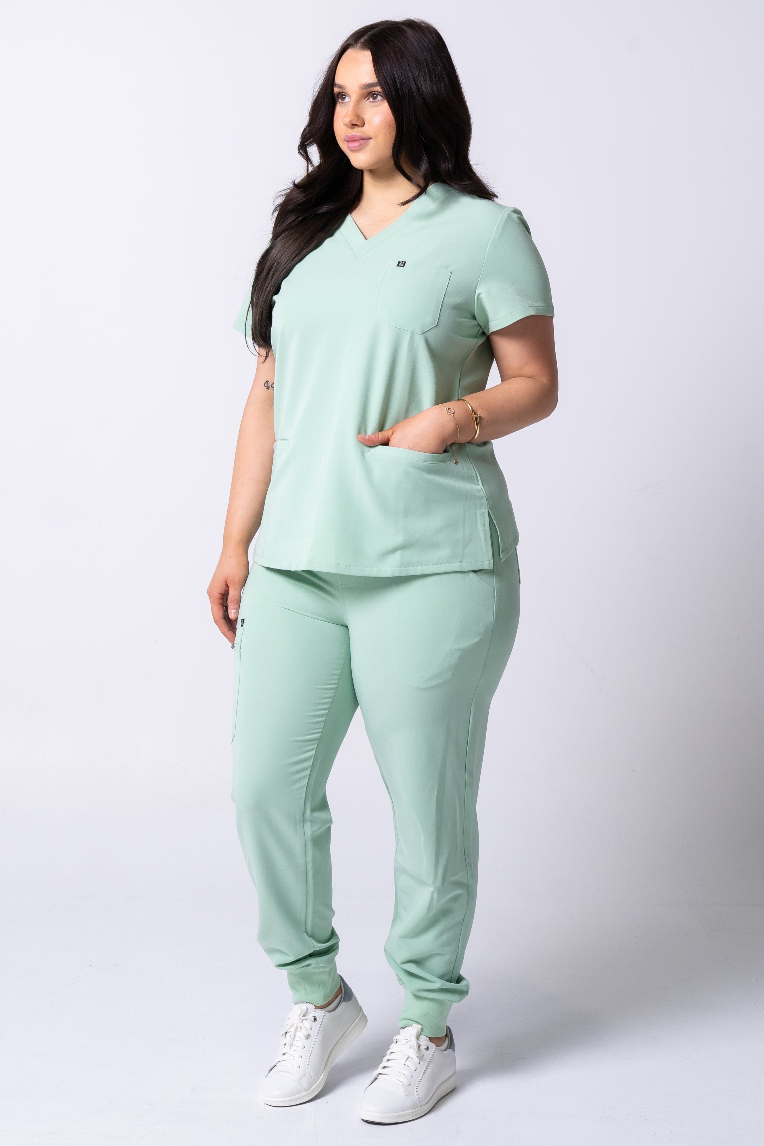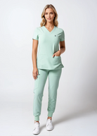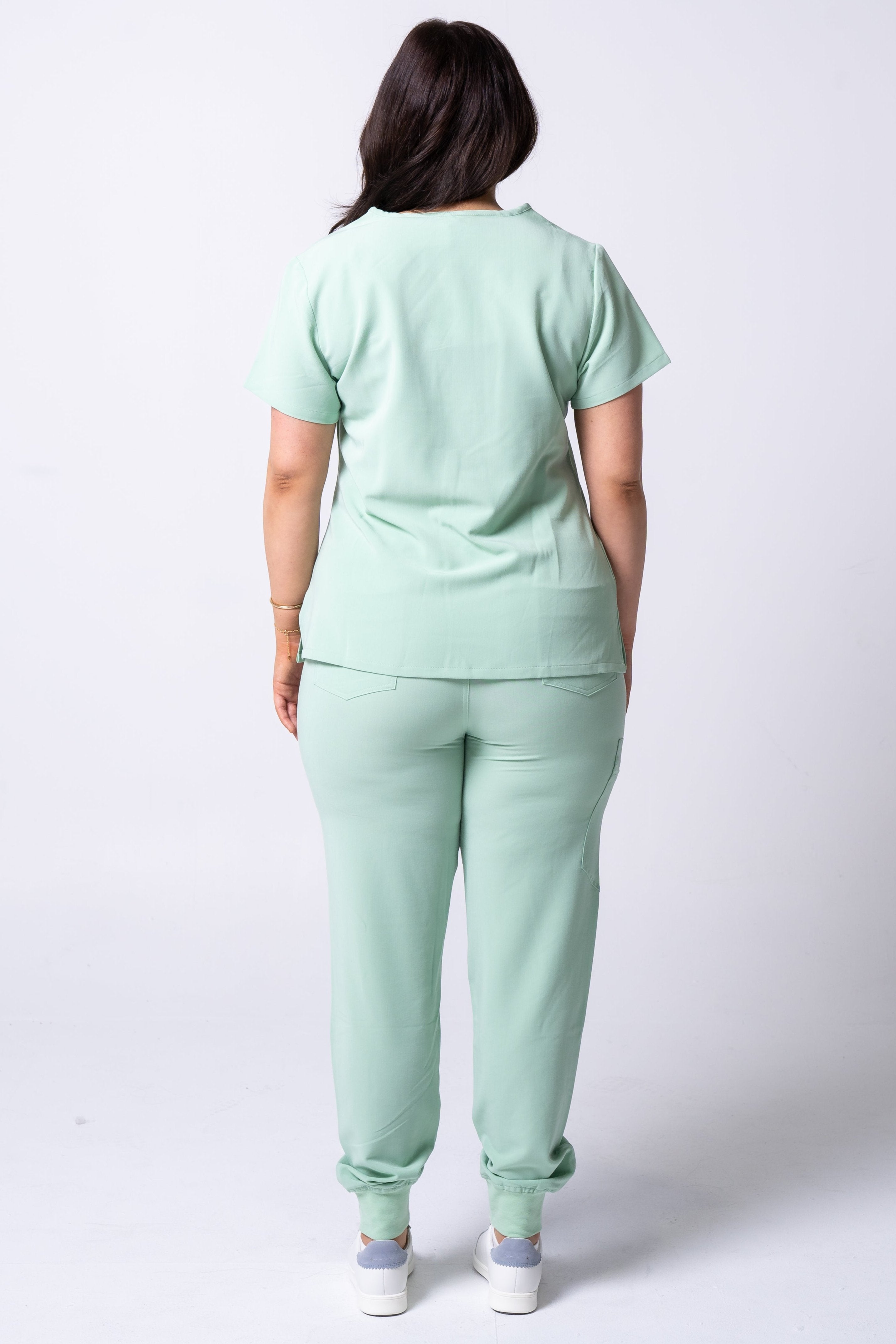 Experience the ultimate blend of functionality and style with our Sigler V Neck Tee x Zandt Cuffed Jogger Set in Mint. Each piece is crafted with premium features designed for medical professionals: