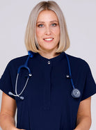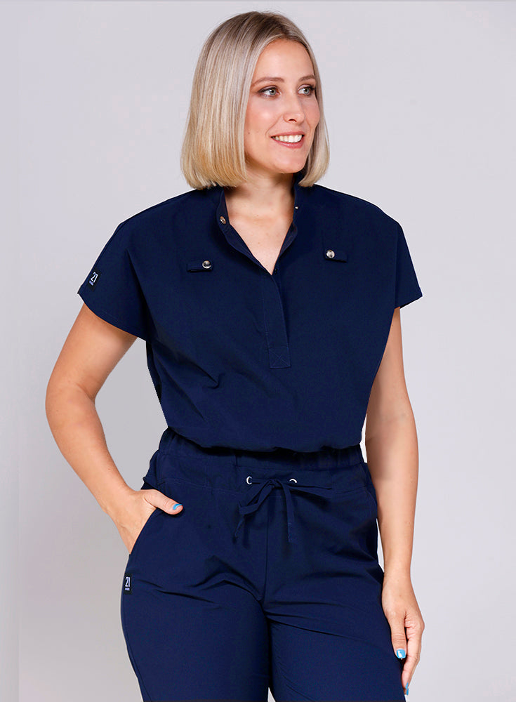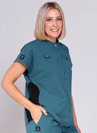 Designed to be tucked in, our popular high collar Elopez scrub top eliminates the need for lower pockets to reduce bulkiness and offer a sleek appearance.