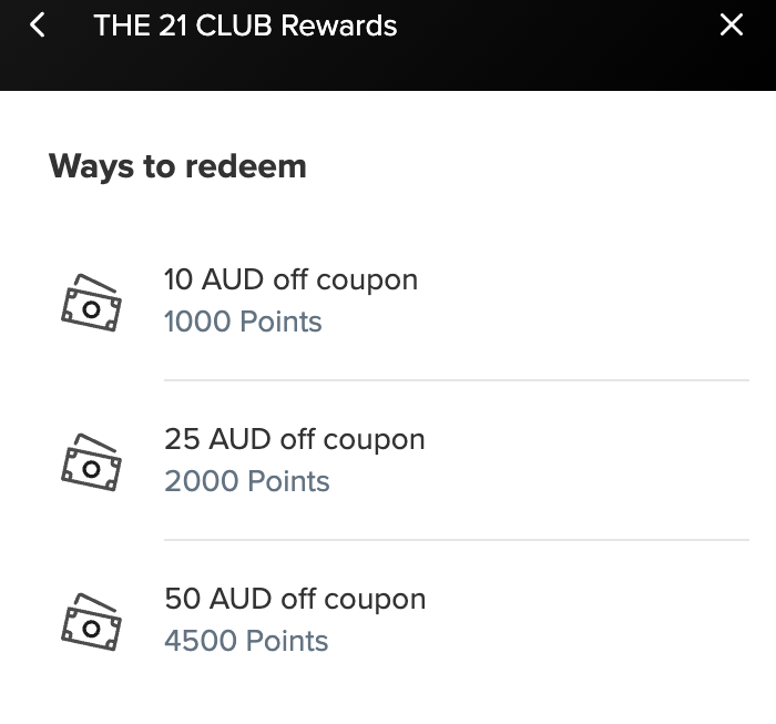 Receive exclusive access to 21 Club VIP perks, earn points on your birthday, earn points for every purchase and redeem $10, $20 and $50 vouchers.